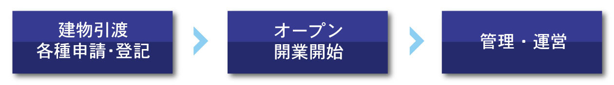 建物竣工・引渡し/各種申請、建物表題登記、保存登記、抵当権設定登記/オープン・開業開始/管理会社選定/空室対策/長期修繕計画