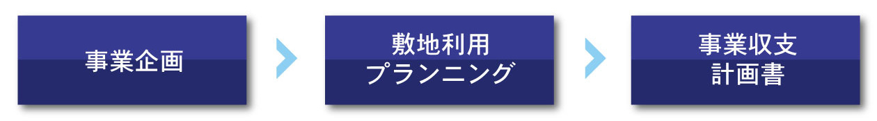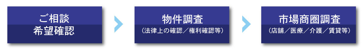ご相談・土地活用希望確認/物件現地確認、都市計画法確認、建築基準法確認、権利関係確認、インフラ確認/店舗市場調査、医療診療圏調査、介護市場調査、その他レジデンス市場調査
